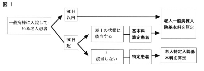 老人患者が一般病棟に90日を超えて入院しても、患者が表1に示した状態にあれば、特定患者にはならず基本料算定患者となり、入院料のダウンも小さく、投薬、注射などのマルメもなくて済む。昨年度までの場合でも同様に、患者が表2の状態なら特定長期入院患者とはならなかったのであるが、表1を表2と比べてみると、随分とその定める“状態”が増えているのが分かる。このあたりが「老人追い出し」批判への対応として読みとれる。