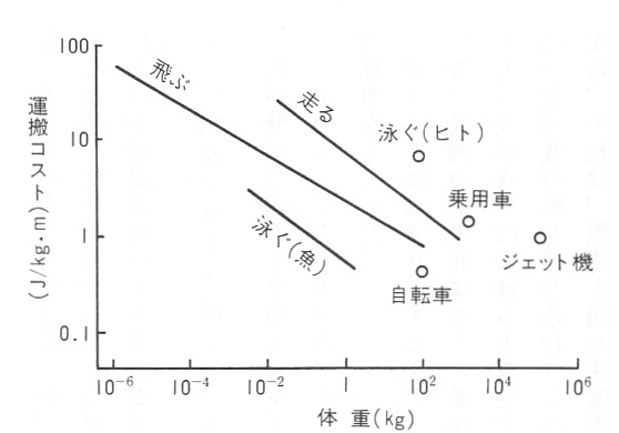 このグラフで面白いのは、自転車、乗用車、ジェット機などのデータが同じ座標平面上にプロットされていることだ。これらの「体重」とは、運転者の体重に車体重量を加えたものとなる。さて、自転車の場合、走る動物の回帰直線から大きく下方に外れている。乗用車の場合は逆だ。つまり、自転車は、平坦な舗装路を走る限りにおいては、移動に係る経済性(省エネ性)において動物界の中で並外れている。百獣の王クラスなのだ。で、乗用車はその逆。ジェット機も同様。