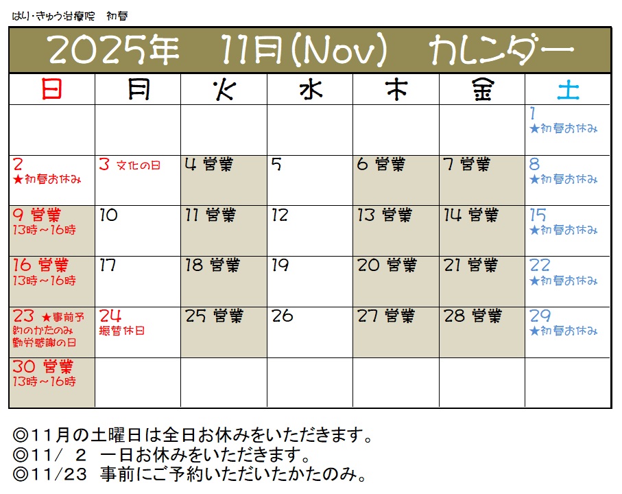 営業日についての詳細は「治療院紹介」をご覧ください。