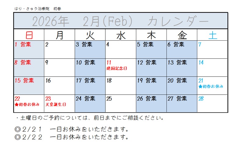 2026年2月のお知らせとカレンダーを更新しました。