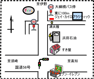 国道56号線より、伊野高岡線を、ダイナムの方向に北へ100m、大綱橋バス停上り下りの間の小路(普通車可)を東へ100m、の左側にあります。