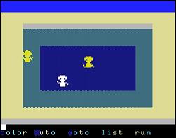 「これは面白そうだ!」ということで、早速プログラミングを行っていく。ブルーのバックに 水とプールサイドをまずは適当に配置してみる。MSXのPCGなら中間色も思いのままである。 そうしてできた背景に、自分と敵はもちろんスプライト。ビッグサイズのスプライトを使えば、 大きなキャラを1文字と同様に扱える。